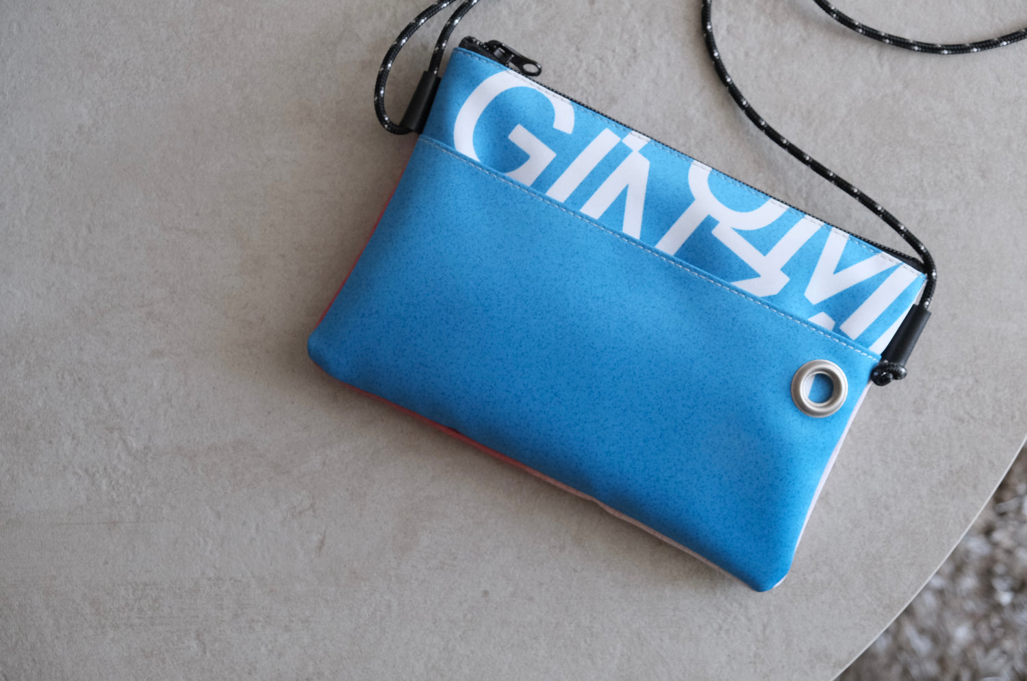 サコッシュは、街路灯にフラッグを括り付けるための「ハトメ」をデザインのアクセントに。 ストラップ部分は長さ調整が自由自在のため、カップル兼用でお楽しみいただけます。